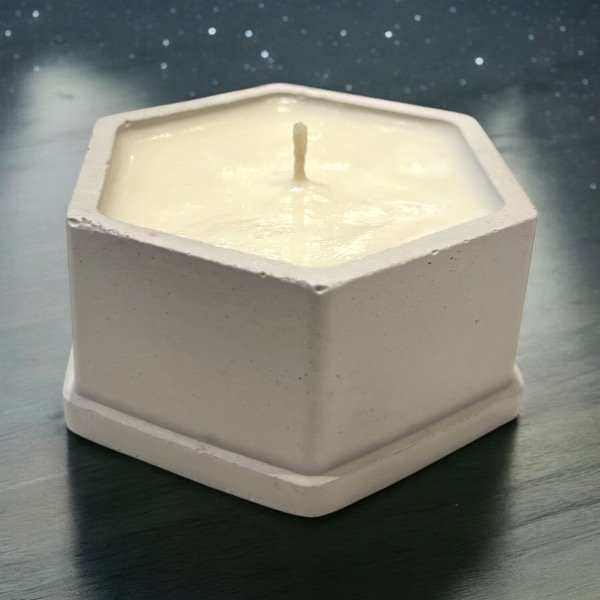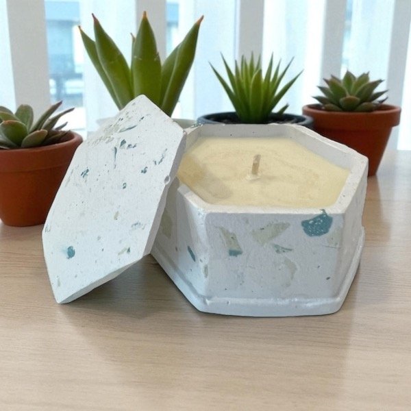 Vela en vasilha con forma hexagonal (con o sin tapa) realizada en cemento blanco o de color, con o sin intervención.