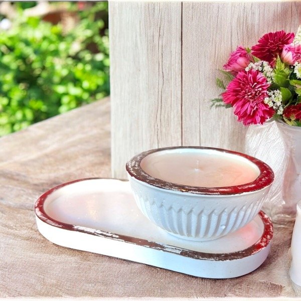 Vela en vasilha redonda estilo semiesfera con recortes y borde liso. Realizada en cemento blanco o con intervención.